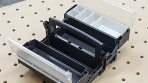 The Systainer Storage-Box is a cantilevered toolbox that provides easy access to all compartments. It comes with five insert boxes, perfect for storing your tools or materials. The side catches securely latch and interlock with a stack of Systainers. Features a translucent lid and light grey insert boxes for a sleek and organized look.